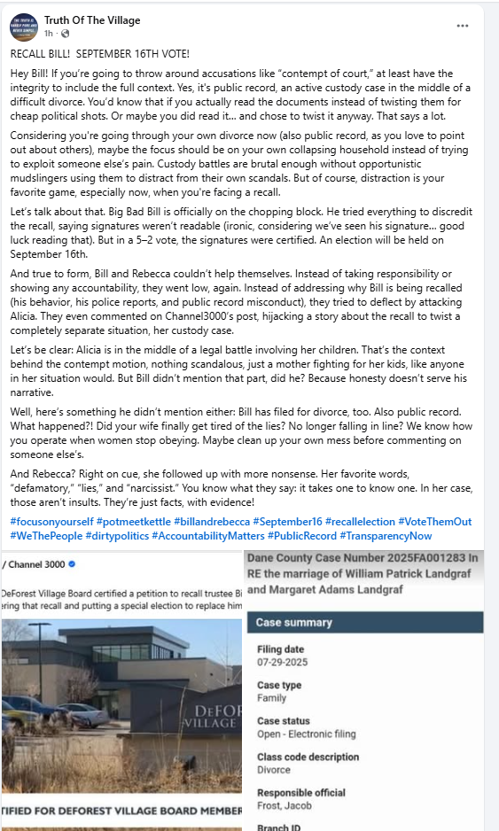Take the current case involving Alicia Williams, who ran as a write-in candidate in last spring’s local Village Board race and has recently declared that she will be running as a registered candidate in the impending recall election in my village in mid-September. A recent post on an anonymous Facebook page called “Truth of the Village”—which made its debut during last spring’s race and actively promoted her write-in campaign while spreading disinformation and defamatory accusations against a couple of incumbents who were running for re-election—is a prime example of the use of both gaslighting and manipulative guilt to deflect the focus off Alicia and onto those who called her credibility into question (see screenshot below—the author of this post sounds hauntingly familiar—oink).